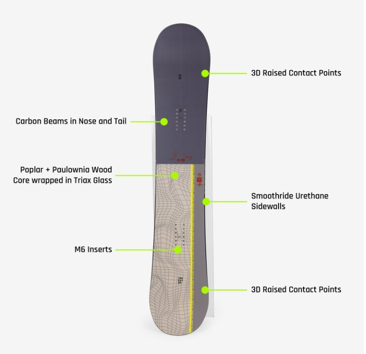 3D Camber: Traditional camber through the midsection for stability, with raised contact points at the tip and tail for a fluid, surfy feel.